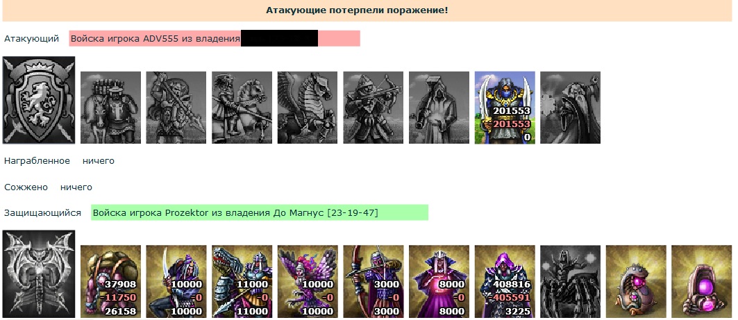 nikoruy61 писал(а):Мне одному кажется, что последний лог больше говорит о нубстве атакующих? По бою защита еще и в плюсе осталась! Да и атакеры потратили гораздо больше, чем нужно для слива такой армии! По мне не зачОт