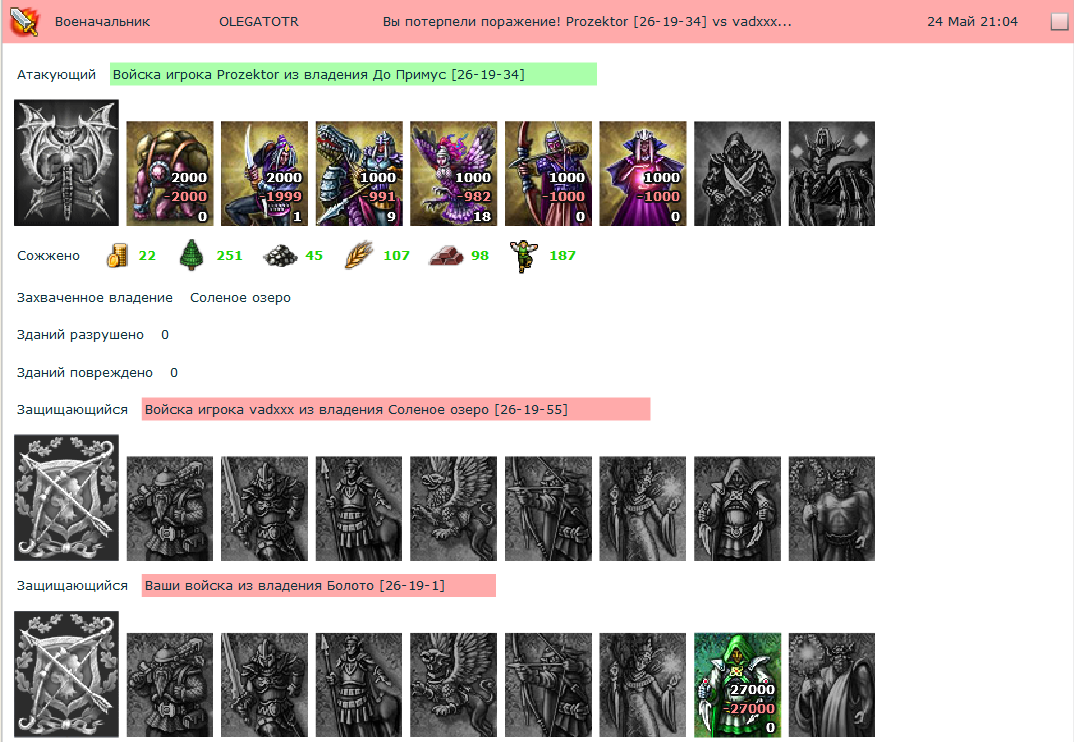По скрину видно, что подмоги нет уже за 50мин до атаки! Если ее боитесь, то посылайте группами, а перед напом смотрите успела или нет и снимайте лишних! Да я и другое имел ввиду. Такие армии надо сливать основами, с пробивом наймами! Как на пятерках молодые сюзеры)) Там бы на слив понадобилось 300к максимум с крутыми башенками и макс защитой( если рейт атакеров состоит не из одних лечилок)darkleon писал(а):возьми в рачет возможную подмогуnikoruy61 писал(а):Мне одному кажется, что последний лог больше говорит о нубстве атакующих? По бою защита еще и в плюсе осталась! Да и атакеры потратили гораздо больше, чем нужно для слива такой армии! По мне не зачОт