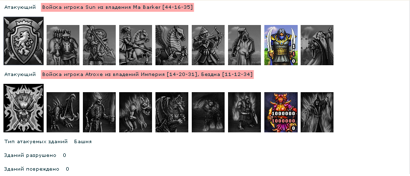 Итак допустим соленка торчала на священной земле (не нашим, не вашим) ... защиту за чж воткнули ... башни обычная 3-й уровень, магбашня 2-й ... дамаг пробивает средний ... задача стоит наказать наиболее эффективно ... пробой руиной в размере 60К наймов я добавил к атаке темного эльфа понятно на самом деле дамага было на 30-50% меньше ...Denis писал(а):Grambler писал(а):потому что простая подстава только со стороны 2-ух подмог убивает 3 волны наймов включая миллионника .... вот цифры оставления части армии со стороны тэ и демона ... атака бьет максимум ...