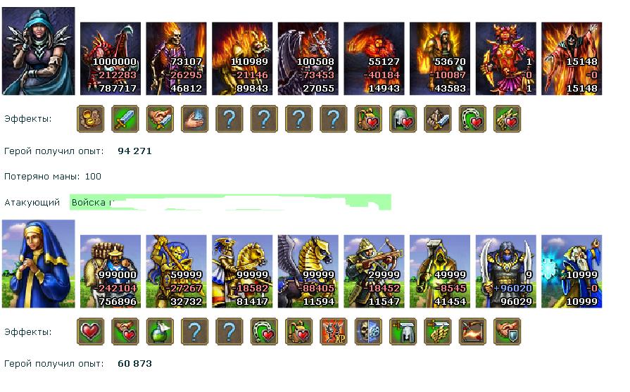 это я могу понять таким войском такую мелочь слить не так уж и тяжело да ещё и при наличии хоть и не сильных но всёже артов и заклинаний но не могу понять одного как у героя с 3-м уровнем развиты до 5-го уровня такие эфекты навыков как скорость героя заклинание маги-защитники регенерация маны и пленение душ до второго уровня вот это я никак понять не могу а откуда я это знаю просто у меня есть отчёт этого боя могу и сюда кинуть если попросите для того чтобы убедиться что я ничего не выдумываюDenis писал(а):да нет, по честномуspawn3000 писал(а): подставной что ли? 20к лечилок. А другой армии почти нету. Где бы таких нубов найти.