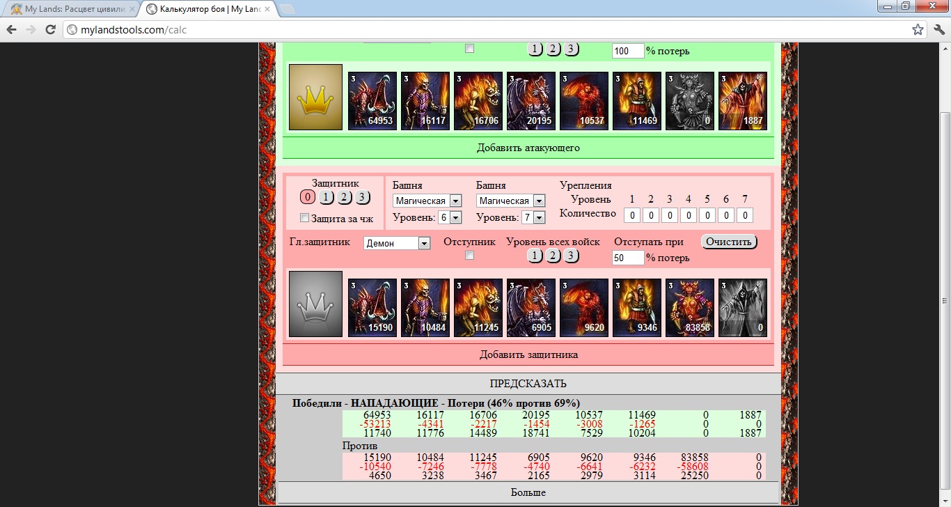 Представляю вам калькулятор боя, написан мной, вроде багов нет, тестите :)