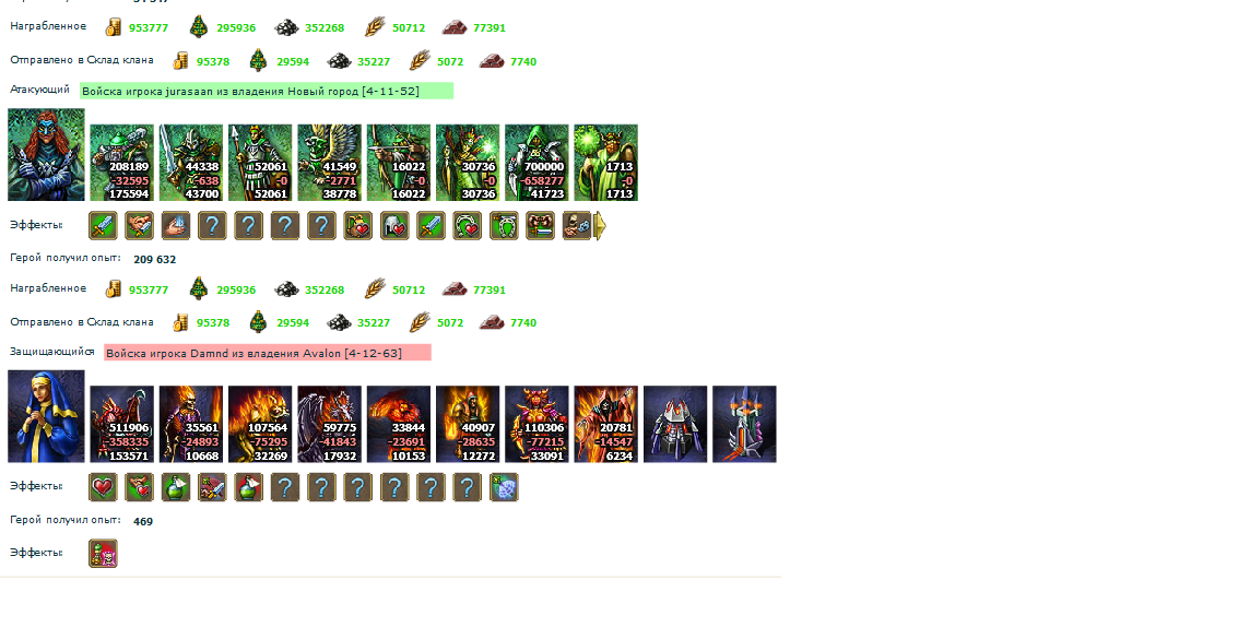 Ну и некоторые пояснения. Армия samsema была заперта в озере(на владение была наложена жадность +500%). Не знаю, чем он руководствовался переводя туда армию... Наверное думал, что его основу и 2 подмоги никто не пройдет. Просто так идти и сливать его армию было нельзя - хоть он и не имел золота спрятать основу, но мог отказаться от озера и основа бы сбежала. Но голд то нужен был и он вышел по договоренности к союзному клану за голдом. Мы дождались пока он дойдет до цели и начнет возвращаться в озеро. После этого отказаться он от озера уже не мог, и мы гарантированно ловили его основу. Очень удачно сложилось и то, что одна из подмог(герой которой хорошо одет), уходила как раз за 2 минуты до возврата войск с грабежа. Атаку построили как раз после ухода этой подмоги. Позднее была прислана другая подмога, но она была гораздо слабее ушедшей.