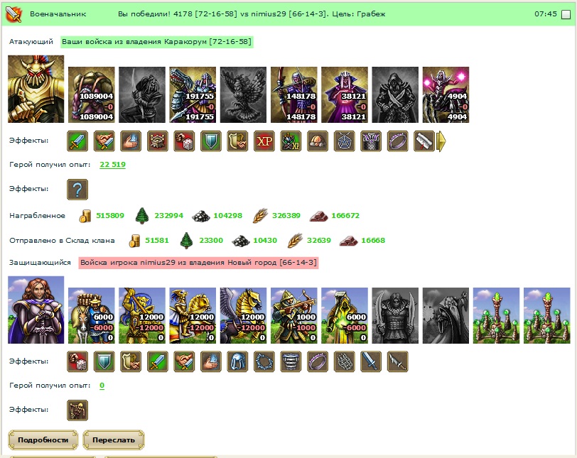 По результатам атаки, у него теперь есть 16к носов и 22к лекарей, ошеломлённый герой, 120к золота и жалование войск 125к в час (отказ служить +200% на 3 дня)
