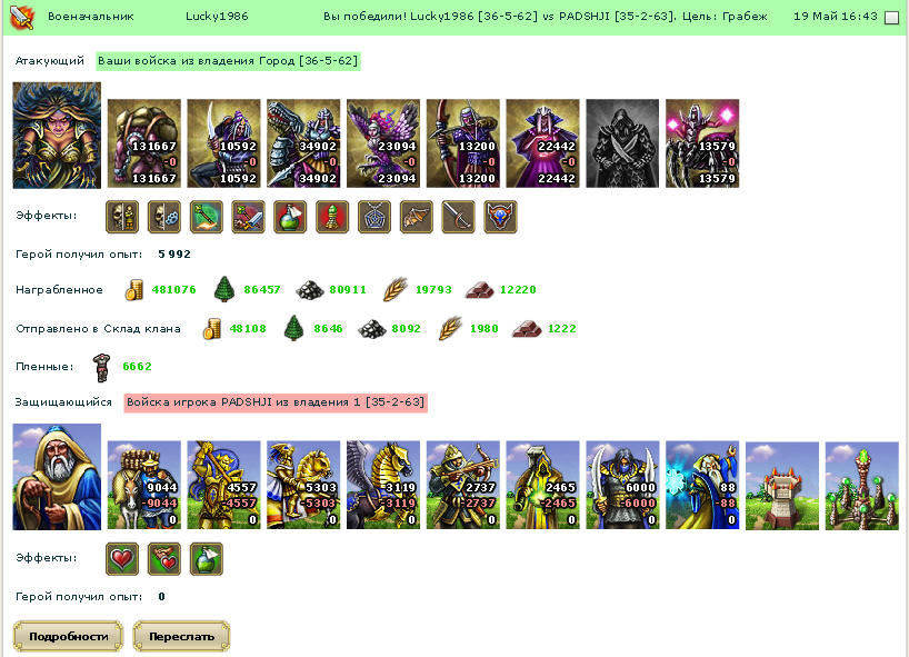 администрация признала что ловушка не сработала, там должны были все остаться у меня, в ноль) но убивать армии сказали это невозможно :)MasterVor писал(а):У тебя там вроде ловушка была. Да и у тебя пришлось бы армии убрать, а вот сколько-неясно. Может потому и не снулили. А тут результат кардинально противоположный от ожидаемого-поражение вместо победы,разрушенные здания(которые чижиков стоят),посёлки занятые мультом. Совсем плохо получаетсяimas777 писал(а):Мурада и воинавтени не обнулили при похожем баге и исходе боя, и янгела тоже не обнулят)Хотя скорее всего действительно всё оставят как есть-администрация всегда права)