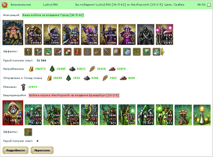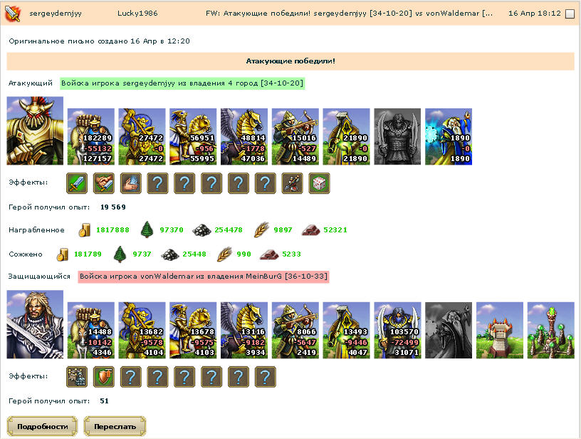администрация признала что ловушка не сработала, там должны были все остаться у меня, в ноль) но убивать армии сказали это невозможно :)MasterVor писал(а):У тебя там вроде ловушка была. Да и у тебя пришлось бы армии убрать, а вот сколько-неясно. Может потому и не снулили. А тут результат кардинально противоположный от ожидаемого-поражение вместо победы,разрушенные здания(которые чижиков стоят),посёлки занятые мультом. Совсем плохо получаетсяimas777 писал(а):Мурада и воинавтени не обнулили при похожем баге и исходе боя, и янгела тоже не обнулят)Хотя скорее всего действительно всё оставят как есть-администрация всегда права)
