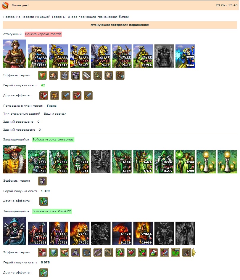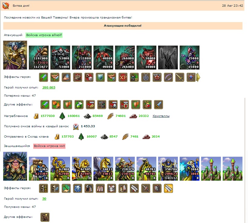 Подняли они воскрешением по 2кк найма, квестами, артами, свитками разогнали атаку. Спрятали под маскировкой армии, но спалились перед выходом (мы поймали момент, когда герои с раздутием были в подвале).