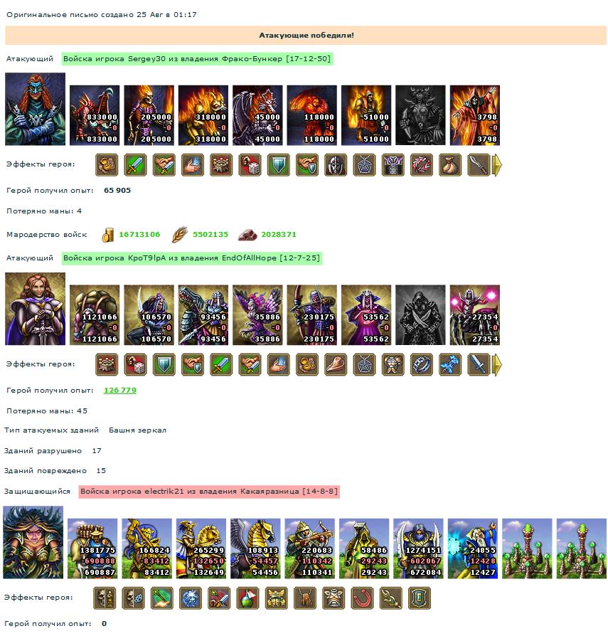 Подняли они воскрешением по 2кк найма, квестами, артами, свитками разогнали атаку. Спрятали под маскировкой армии, но спалились перед выходом (мы поймали момент, когда герои с раздутием были в подвале).
