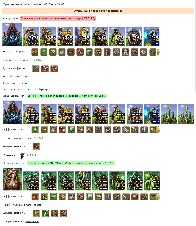 Подняли они воскрешением по 2кк найма, квестами, артами, свитками разогнали атаку. Спрятали под маскировкой армии, но спалились перед выходом (мы поймали момент, когда герои с раздутием были в подвале).