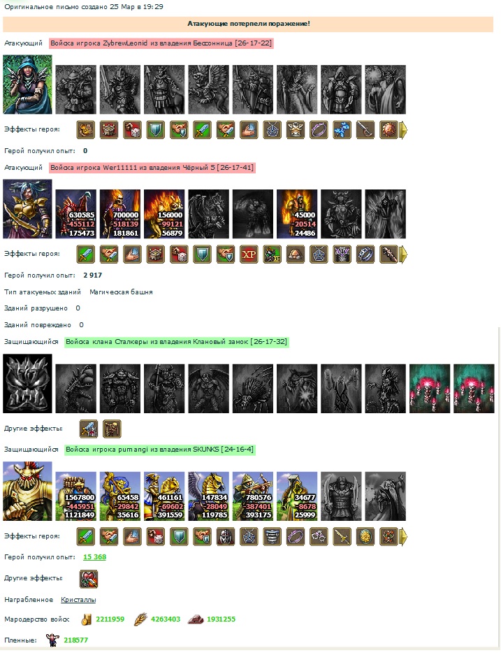 Ну теперь напишу я, то кто начал этот поход.Вышли мы сломать клан-склад мантикорам.И с этой точки зрения поход цель выполнил на 100%, учитывая 2-жды смену хозяина там мало что осталось.Теперь насчет невидимок, я вообще лёг спать отправив армию, ну стало меньше картинок, что в этом ужасного.Мне жалко людей пытающихся заработать здесь средства на жизнь.Так-что количество армии для меня лично не существенно, потеряв какую-то часть армии или даже 100% её я просто стану свободнее по времени, а вот оппонент, я боюсь с голоду рискует умереть, если правда, то что про него говорят. По поводу защиты в копи, с утра прислали шпионаж с копью герметика, там были только казармы луков.А вечером другая копь и там строится защита по полной, с чего бы это.Теперь отвечу neham.Почему то бой где он потерял более половины армии он называет подслили, а там где я треть потерял называет положил.
