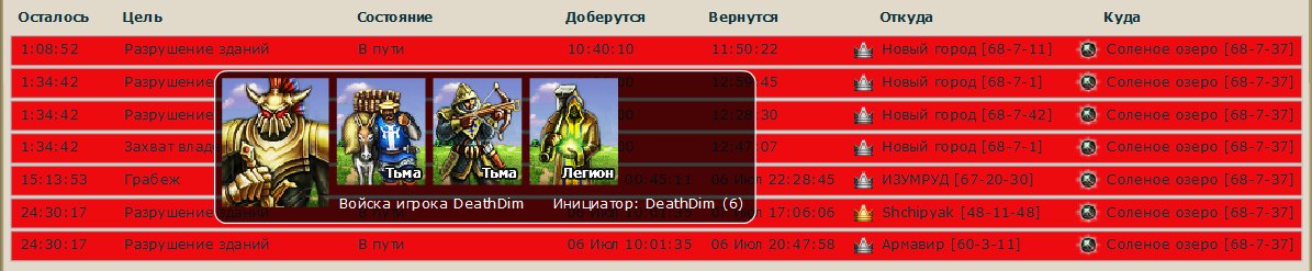 Cleverest писал(а): Пишу все по порядку: Нам засветили озеро, мы заметили что там нет сапог, но ночью они появились. На следующий день понаблюдали, во сколько исчезли сапоги, и во сколько появились. Приняли решение атаковать из соседнего королевства в то время, когда нет сапог. Назначили время атаки. На следующий день (то есть вчера) приехали и забрали. С первого раза не сломали защиту, что крайне удивительно, так как укрепления зданий не было, и тем не менее укреп например не упал после двух атак с топором головореза. Укрепления зданий в озере не было, так как вам порезали дальность заклинаний и вы из столицы не доставали, а некр с посохом на дальность возвращался с руины уже после атаки. Вообще атак должно было быть больше, но двое приехали на руины, причем на моей клетке руина выросла в промежутке между постановкой лагеря и постановкой поплавка. Поскольку с одной волны озеро не забрали, то на возврат некра вам кинули сковки, чтобы спокойно сделать вторую волну. Выйти на озеро вы не смогли, но кинули укрепление зданий. Была попытка подмоги от Kiokushinkay, которая тут же отменилась, и непонятная подмога от Абнимашек, которая приходила уже после второй волны.