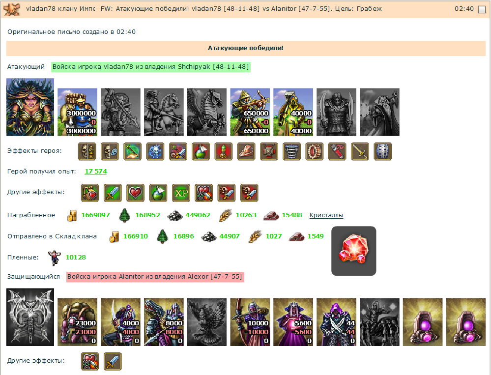 А что выкладывать если половина пришельцев боятся всего??? я сегодня ходил выносить зеркала 7 лвл он сильние меня и переместил арму в тот город где рушил и снова побежал в столицу! или как ходил к игроку с того же клана грабить просто так там подмога шла и что обкастовался и пошёл! подмога отменилася за 4 минуты до боя!!! О каких битвах тогда можна говорить???Nichao писал(а):Когда начнете уже скрины боев покрупнее выкладывать?