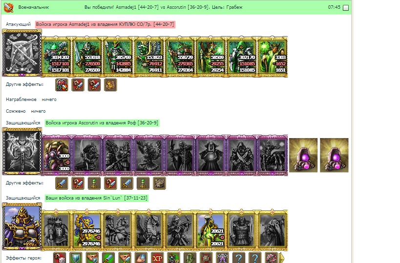 Утро) С отпуска) Игра потихоньку умирает) Ну и пофиг) Вышел, топать 20 мин, смотрю раз хелп, герой со слабостью, два хелп такой же и у обоих еще арфа и маска ужаса, свои снял. Дошел, принял бой) Единственное, что не учел, так это, что в столе было почти 300к коней на моих 1,5 ляма пехов)) А я еще и всеобщее преследование раскачал))) В отчете 2-3 недельной давности не было коней в столе)) Уляля труляля, идут войска без генерала в унынии обратно)