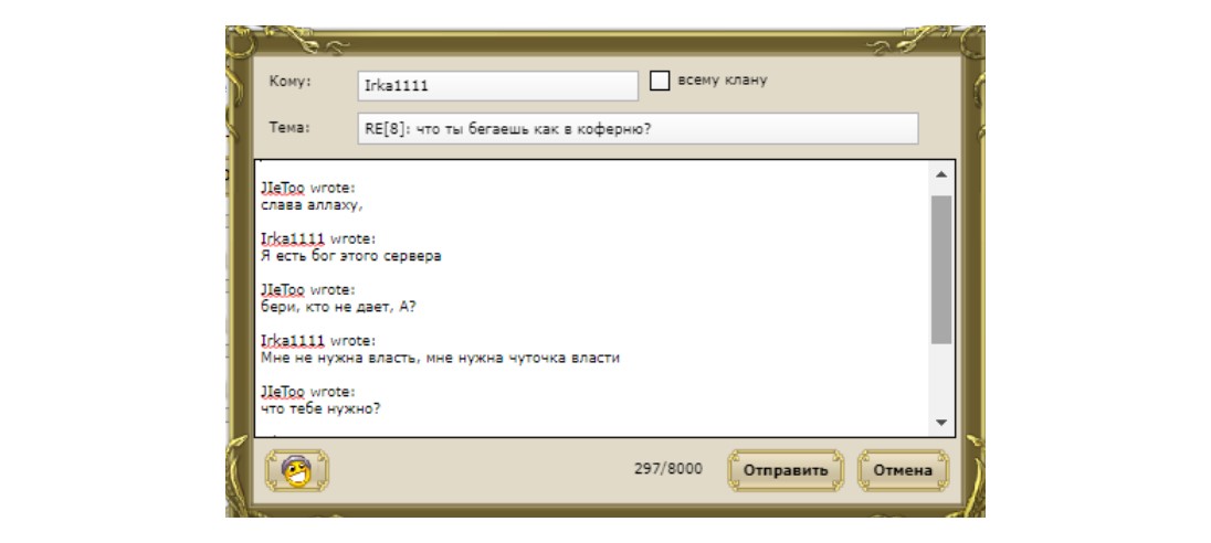 Я же не могу как ты, забиться в один город и огранить только оттуда. Наверное же я перекинула войска в разные города и чистила сразу несколько точек? И что же это означает? Наверное то, что войска разделены и находятся далеко от стола. Оставлять точки фарма без защиты опасно, и получается выгодно захрамить тебя и твоих мулов. Наверное тебя задело, то что стол открытый и беззащитный, девушки которая тебе стоит как ком в горле так хочется отомстить и показать кто тут мужик. Но для тебя есть одна неприятная новость, если ты не помнишь, то у наших отношений матриархат. Так что пойди подумай над тем, как еще доказывать что ты мужик д-б JIeToo... цок цок цок...