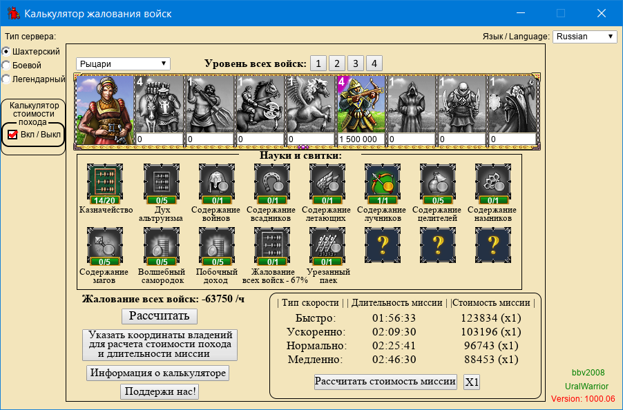 Представляем вам, новый, универсальный калькулятор рассчета жалования войск, длительности миссии и стоимости похода. Данный калькулятор способен рассчитать жалование войск учитывая науку, свитки на срез жалования, учитывет навыки героев - дух альтруизма, содержание магов, содержание целителей, а так же учитывая свитки на срез жалования войск и артефакты - как комплекты, так и отдельные арты из сетов. Если вам необходимо рассчитать длительность вашей миссии, то вы можете включить соответсвующую функцию ("Калькулятор стоимости похода") - указать координаты владений в соотвествующем окне, указав сапоги на замедление миссии и на скорость. Если вам нужно рассчитать стоимость похода, например, если вы хотите отправить всю свою армию на гробницу в другой угол карты - вы можете прикинуть стоимость похода - введя количество армии и координаты владений.