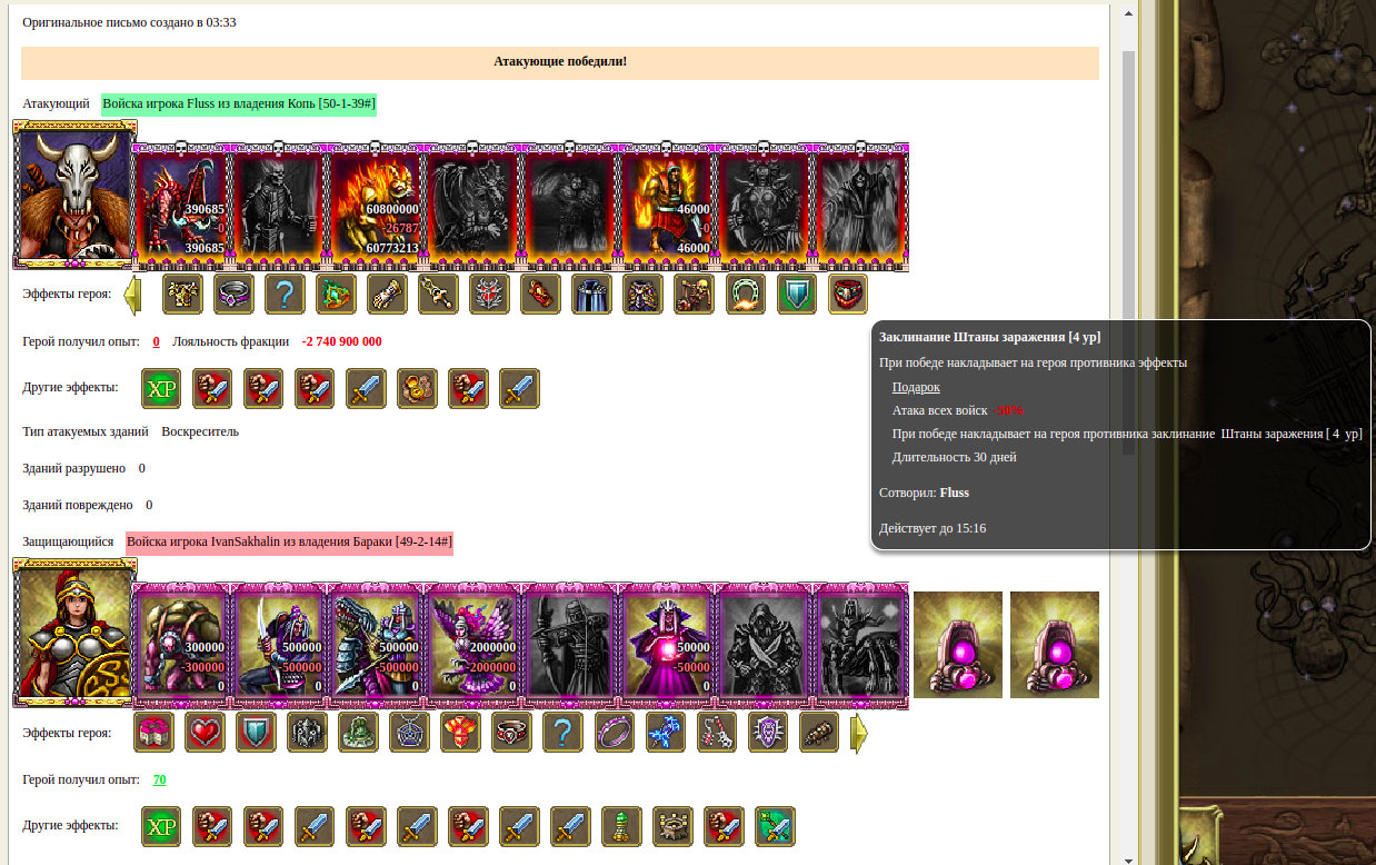 Их соклан, решивший стоять до конца))) как бы не играет уже месяца два и армия все время бежала, поселки давно упали. Ворота открылись сами скорее всего и вот тут наш академик решил поживиться. Но что-то пошло не так))) Он просто перепутал две атаки, первой пошла атака со слабым героем, а второй с боевым)))) но когда он это увидел, решил что и так сойдет. Но не сошло. Бой очень позорный. Надеюсь это будет всем уроком. :pardon: