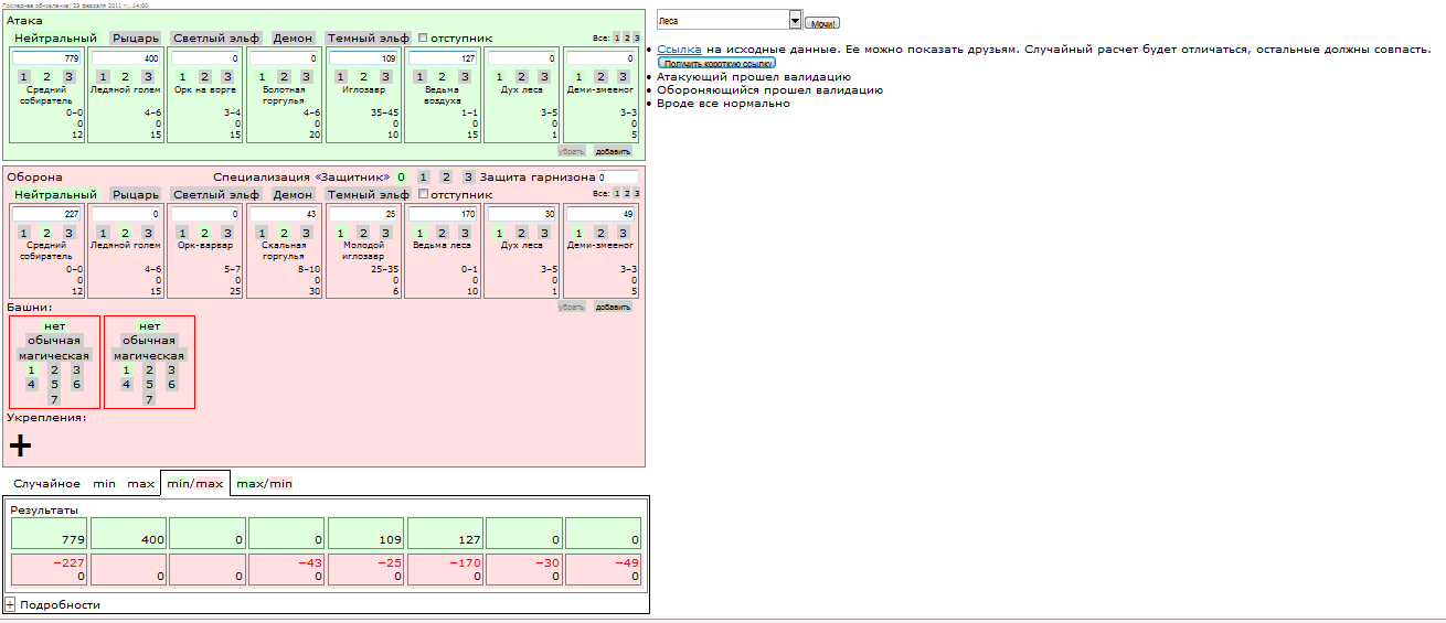 минуса были, проблема в обнулении переменных, тоесть первый раз считало правельно, но при втором подсчете данные с количеством снятия башеного урона несоотвецтвовали...устранил...проверял ставя 30 магов(рыцари 1лвл) и простую башню на дамаге мин/мах - убило всех, поставил 50 магов убило 40, поставил 69 умерло 2(как раз те 10 урона которые остались) и наконец 70 и более магов привели к нулевым потерям...bodunok писал(а):В калькуляторе количество магов не влияет на потери при атаке города с башней! Надо исправлять. Рассчитывал одну только башню, без войск для чистоты эксперимента. Результат - любое количество магов никак не влияют на потери.