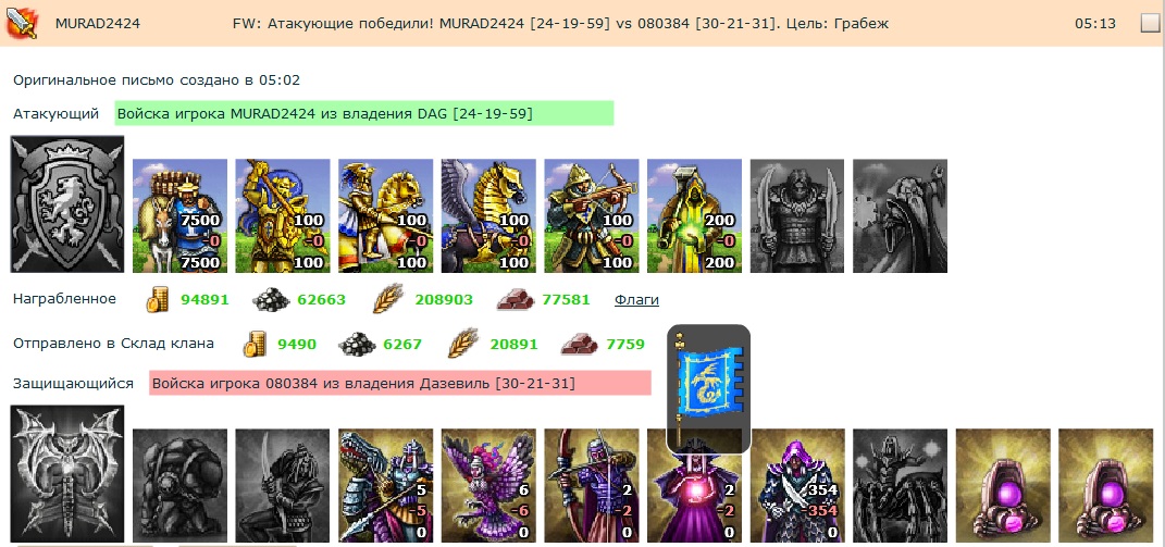 А так, собственно это я убрал с защиты мурада, после того как руина сошла в нули. Что бы он не потерял 50% своих войск, я отозвал его войска. Мои хоть и приняли удар, но были максимально защищены терайном и доп башнями- так что ля ля тут не надо. Все было по уму. В клане умеют своих защищать, если только это не из подтишка как ты это пытаешься в обратку доказать.