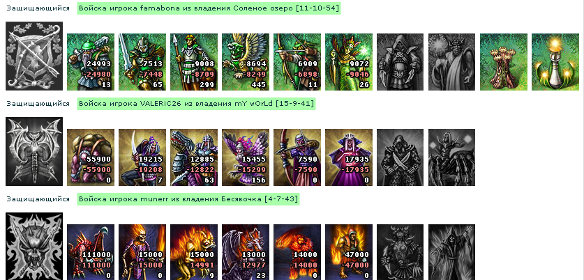 Итак допустим соленка торчала на священной земле (не нашим, не вашим) ... защиту за чж воткнули ... башни обычная 3-й уровень, магбашня 2-й ... дамаг пробивает средний ... задача стоит наказать наиболее эффективно ... пробой руиной в размере 60К наймов я добавил к атаке темного эльфа понятно на самом деле дамага было на 30-50% меньше ...Denis писал(а):Grambler писал(а):потому что простая подстава только со стороны 2-ух подмог убивает 3 волны наймов включая миллионника .... вот цифры оставления части армии со стороны тэ и демона ... атака бьет максимум ...