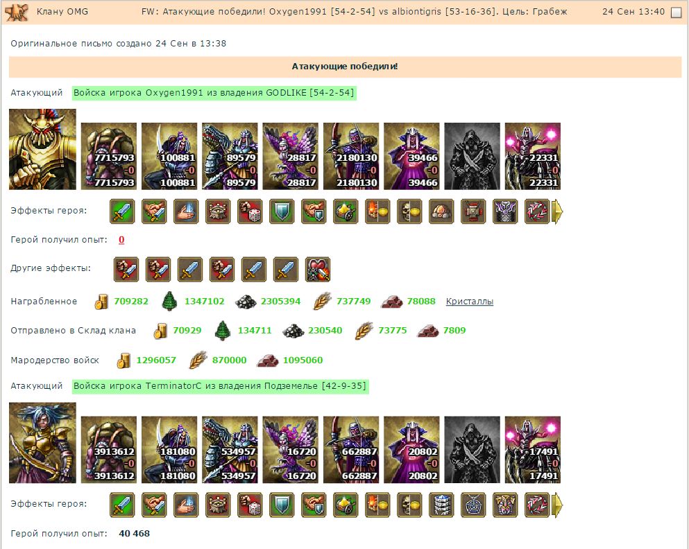 Не могу понять, приехал клан с армиями и героями, месные воины вместо того, чтобы воевать, все прогинаються под это зверье - Ульты. Понимаю, там Торментор, его Вольт сливав 7 или 8 раз и всякие нубы, которые под всех лягут, а бы их не трогали и им руины были. А команда из Викингов, которых храмили Крестоносцы и другие кланы, снова кинули на Барента клан, он сброд набирает. Не могу понять таких игроков, как Линн, Тюльпан, Фараон, Зорг, Серафим, Аркгран и т.д. И вот вам пример, не зависит, какая у тебя армия, если нет ума.