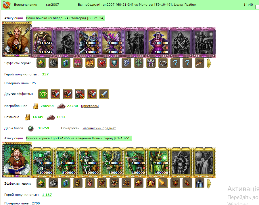 Бой закончен. Наши лекари с помощу магии исцелили всех раненых и воскресили погибших воинов. Мы взяли цитадель монстров практически голыми руками и без потерь. Конечно пригодились навыки героя и его артефактов. Истребив почти всех монстров , мы открыли сокровищницу и обнаружили гору драгоценного жемчуга. Забрав золото из закромов на содержание армии, ну и конечно же железо, которое всегда пригодиться при строительстве и не только. И прихватили огромный сундук с черным жемчугом, ради которого этот великий поход и затевался. Спокойная радость и умиротворение окутали нас, несметные богатства сегодня наши. Пока ликующие воины грузили богатства в повозки, герой снова осмотрел сокровищницу. Ему повезло обнаружить древний пергамент с заклинанием и редкие кристаллы. Погрузив богатую добычу, все отправились домой отдыхать, чтобы чуть позже прославить сражение в таверне и поведать всем о нашей победе над легендарной Седьмой Архируиной!